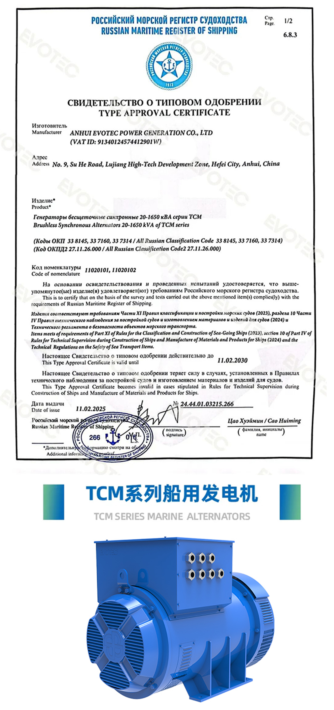 In April 2025, EvoTec marine generators successfully passed the stringent audits of the Russian Maritime Register of Shipping (RS) and were officially awarded RS certification.