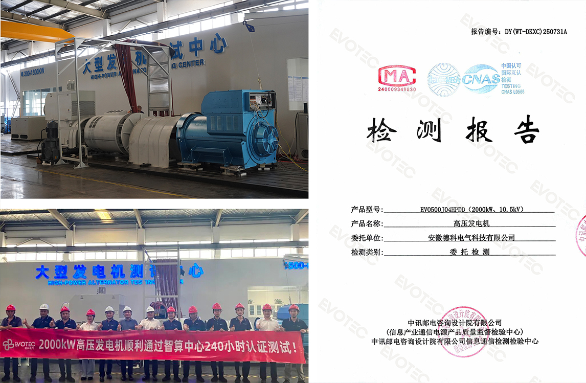 In August 2025, EvoTec’s 2000kW high-voltage generator completed a 240-hour continuous full-load endurance test under nearly 40°C ambient temperature, followed by a three-hour